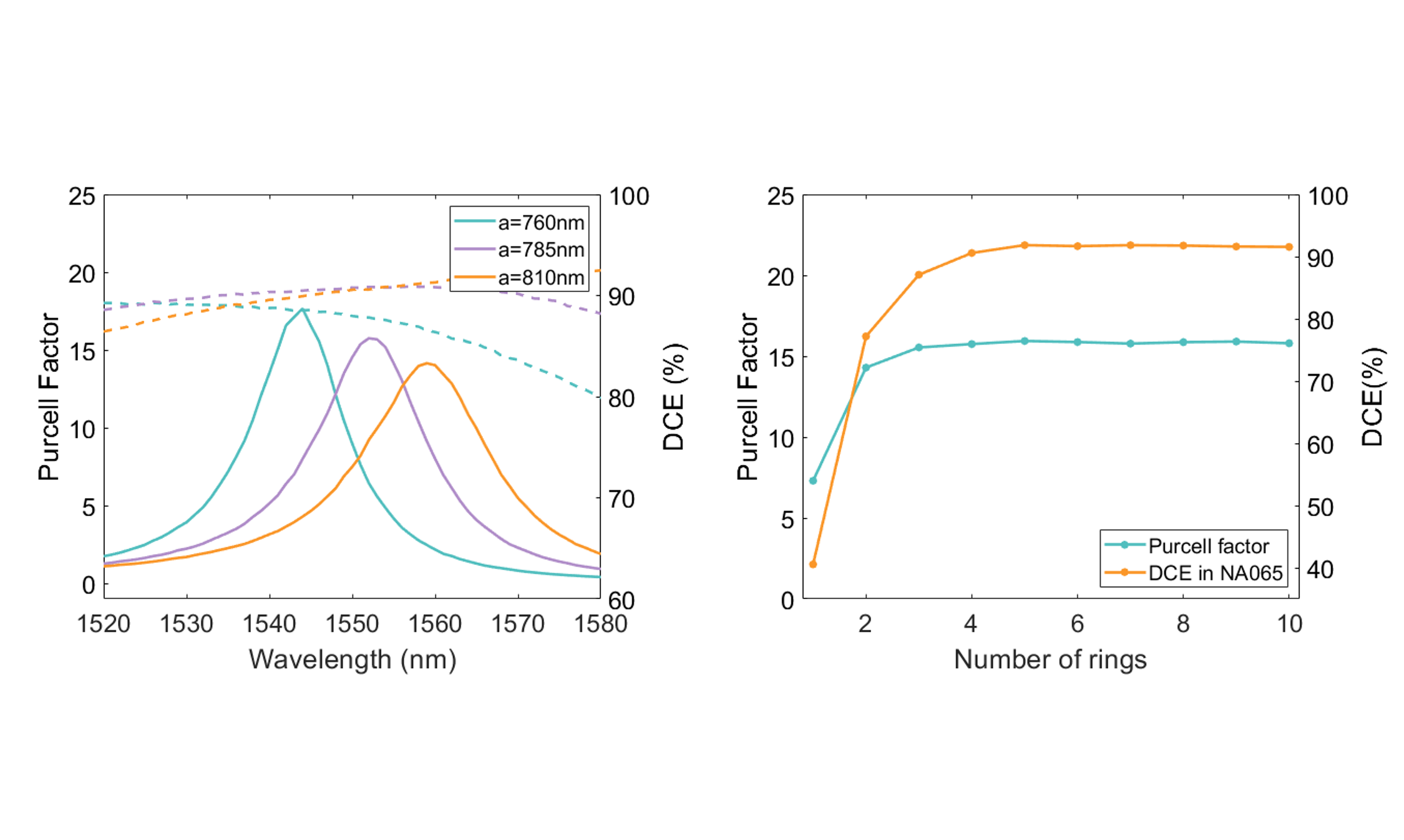 Once the optimal radius and oxide thickness are determined, further refinements can be made by adjusting the grating parameters to enhance both the Purcell factor and the collection efficiency. The trench width w, the grating period a, and the number of rings N influence the outcoupling efficiency. By varying these parameters and analyzing the corresponding figures of merit, an optimal balance can be achieved.