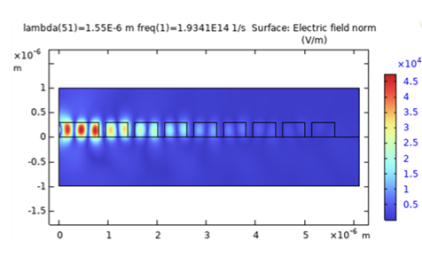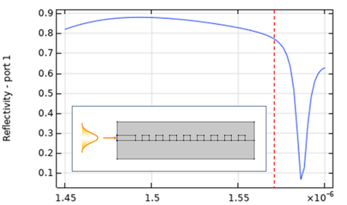 Given that solving a full 3D FEM model can be computationally intensive, an efficient starting point for the design process is to analyze a 1D InP grating, which corresponds to a radial cross-section of the bullseye resonator. This simplified model consists of an InP grating on a SiO₂ layer and immersed in air [1]. For a target resonance wavelength of λ = 1550 nm, initial design parameters can be set based on fundamental optical principles: the InP slab thickness is chosen as half the effective wavelength in InP to support only a single TE mode, the grating period is set to a = λ/ngrating to satisfy the second-order Bragg condition, and the trench width is taken as 50% of the lattice constant. The structure is excited by launching a 1D TE mode within the slab, and the reflectivity as a function of wavelength can be determined by monitoring the reflected power at the input port. The band edge of the reflection spectrum indicates the wavelengths at which photons will be reflected and partially scattered in the upward and downward directions. This can be further confirmed by visualizing the electric field distribution at the target wavelength. Since this 1D model is computationally efficient, it enables the exploration of a broad parameter space, facilitating the optimization of the grating design before transitioning to more complex 3D simulations.
